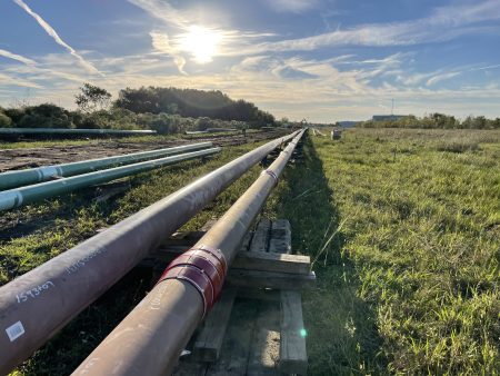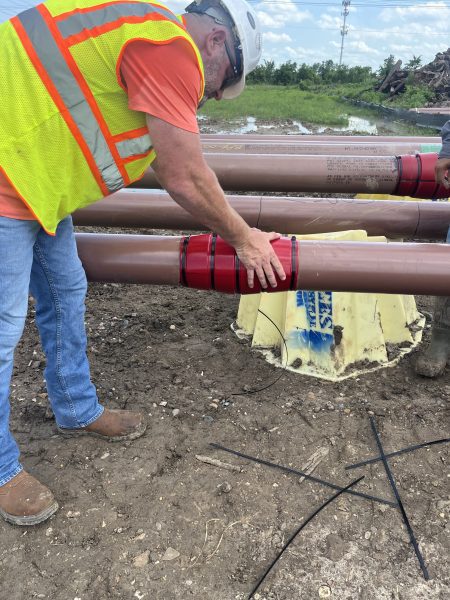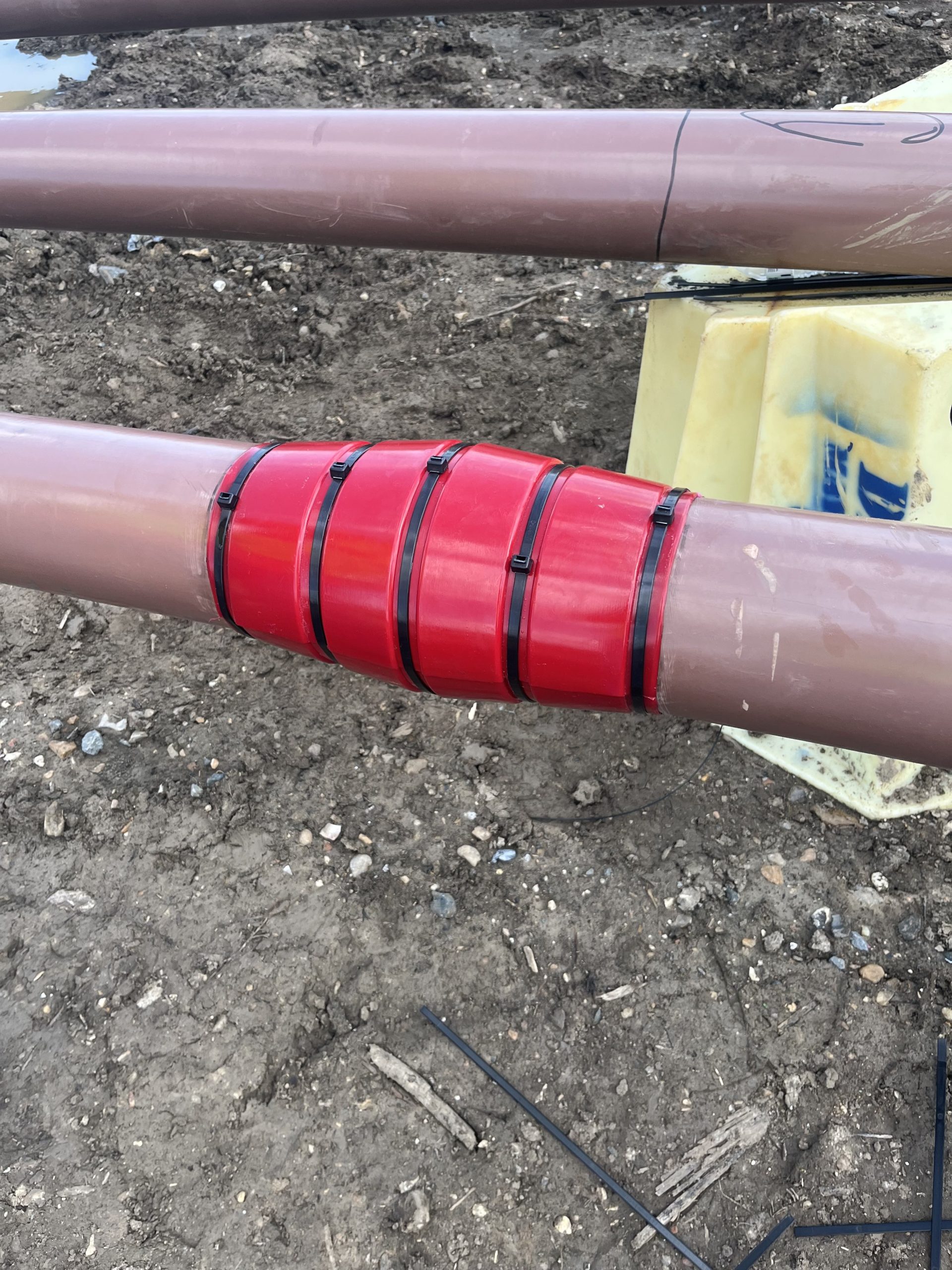 Bullet Bumper was designed to meet all the needs required when pulling HDD bundles into a single borehole. In crowded ROWs pipeline companies need to run multiple pipes into a tight area, pulling multiple pipes in to one single borehole instead of separate drills. When pulling multiple pipelines in the same borehole spacers are required to keep each pipe from damaging pipe coatings. Bullet Bumper has come up with a user friendly pipe spacer that’s twice as fast to install and has a unique shape to which allows the Bullet Bumper to easily transition over pipe rollers and pipe cradles safely with little to no resistance.